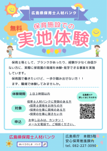保育施設で働きたい方に対して、保育施設等での実地体験・見学を通して、保育現場の状況を把握してもらい、就職に向けての不安等を解消することを目的として実施しています。